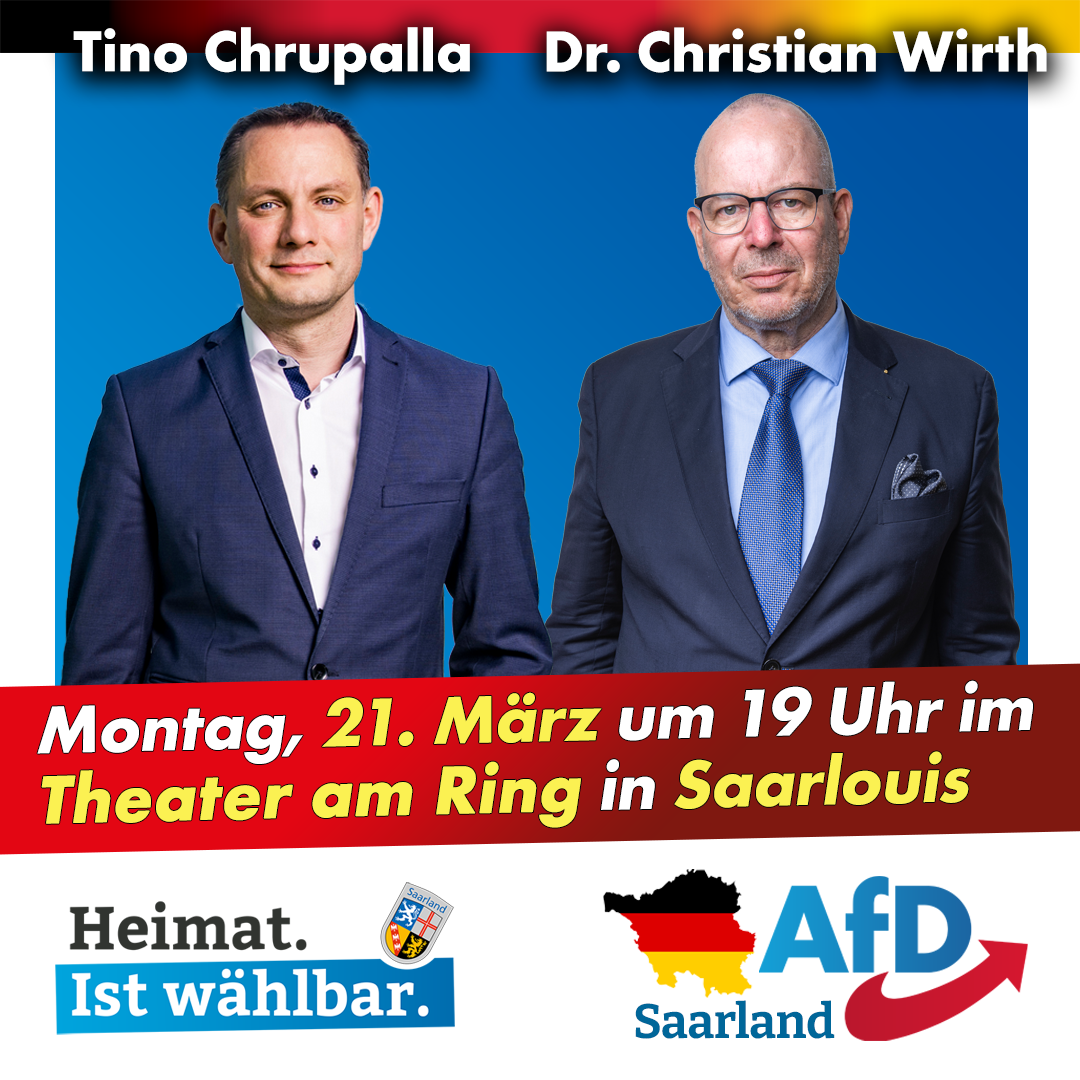 Wahlkampfveranstaltung mit dem AfD-Bundessprecher und Fraktionsvorsitzenden im Deutschen Bundestag, Tino Chrupalla und dem saarländischen AfD-Bundestagsabgeordneten Dr. Christian Wirth. Wann? Montag, 21. März 2022 um 19:00 [...]